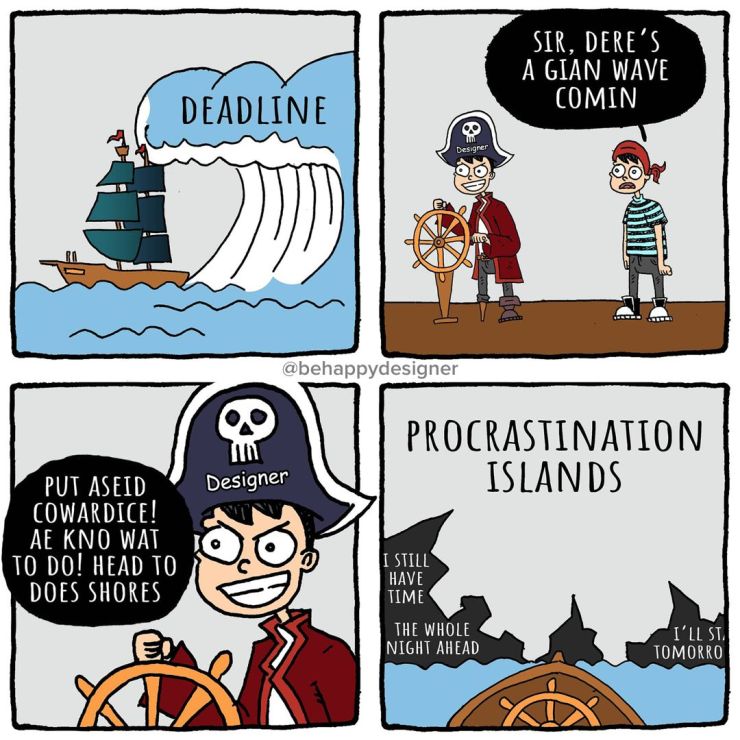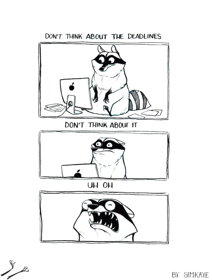 The first and foremost heathen that gives me the strength to do my assignments in the last minute is procrastination laid ease. It’s no joke when I say my brain and procrastination battle it out in my head on whether do the assignment well before time or not and well, you know who wins. I convince myself saying it’s not an issue, I just prefer doing all my work in a deadline-induced panic , no big deal, really (sweats intensely). This confidence also comes owing to the fact that I have made it out alive several times in the past. The feeling of rush going right up to the deadline (or even crossing it in my case) and having centuries old dark circles and blood-shot eyes after pulling an all-nighter sure is golden. It makes me think that if I can do so much in such short time imagine how much I can accomplish if I had more time (yes, only imagine).